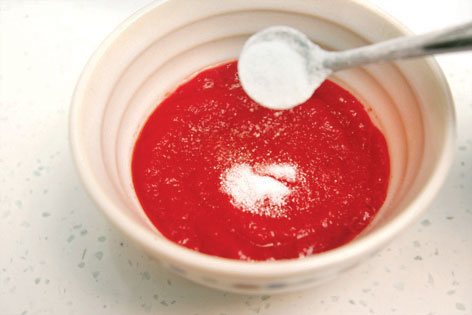 加油盐保存番茄酱 密封的番茄酱打开食用后,往往一次用不完。番茄酱暴露在空气中,细菌和微生物的污染很容易使其变质发霉。防止的办法是在番茄酱面上均匀地撒一点食盐,再倒上一点油,就可以延长保质期。
